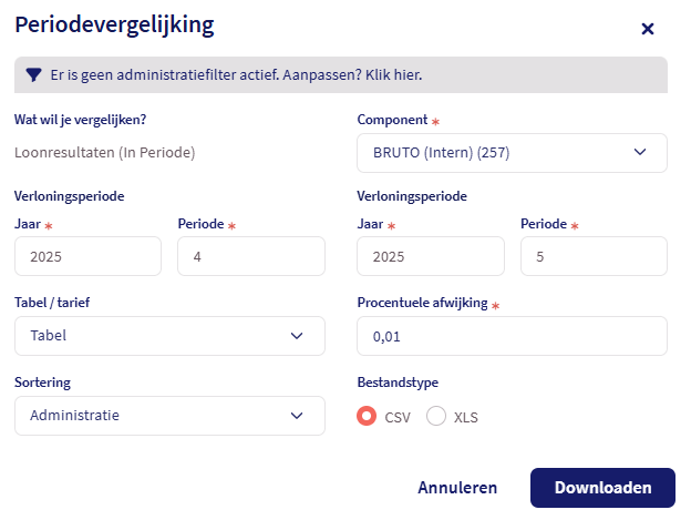 Betreft het Component welke vergeleken moet worden met voorgaande periode. Je kunt in tegenstelling tot Loket Classic kiezen uit alle componenten. Standaard wordt het component BRUTO (257) voor je geselecteerd.