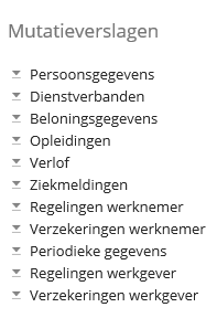 2. Tevens kan er gebruik worden gemaakt van de mutatieverslagen welke te vinden zijn onder Overzichten -> Mutatieverslagen. Onderstaande overzichten zijn hier te raadplegen. Deze overzichten hebben voornamelijk betrekking op de diverse tabbladen die bij de werknemer kunnen worden gemuteerd.