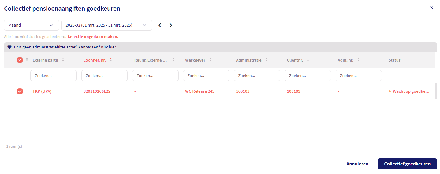 Vanuit dit scherm is het ook mogelijk om de collectieve acties Pensioenaangifte starten en Pensioenaangifte goedkeuren te starten. Dit doe je via de button Collectieve acties of via Collectief - Pensioenaangiften
