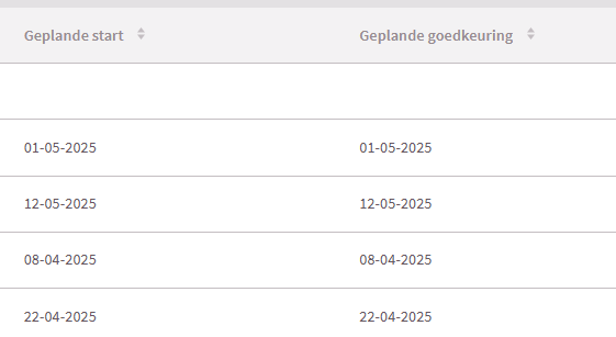 Wanneer je de filter automatisch verwerken op Ingericht plaatst worden er extra velden in het statusoverzicht geplaatst, namelijk Geplande start en Geplande goedkeuring.