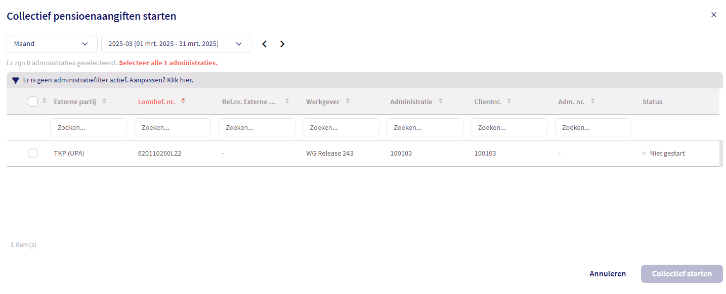 Wanneer je hiervoor kiest worden de administraties getoond die voor de geselecteerde periode in aanmerking komen om daarvoor een pensioenaangifte te kunnen doen. Deze hebben de status Niet gestart en hebben in de voorliggende periode een reeds afgehandelde pensioenaangifte.