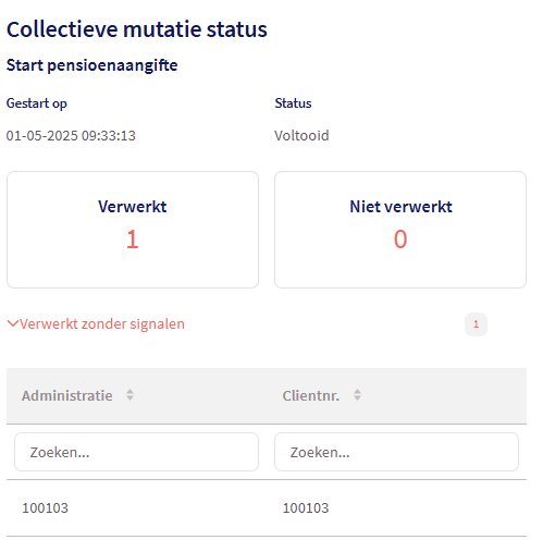 Wanneer je op Collectief starten klikt worden de geselecteerde pensioenaangiftes aangemaakt en wordt via het berichtencentrum de status van deze actie weergegeven. Eenmaal afgehandeld kun je de status nog even bekijken en kun je eventuele niet verwerkte pensioenaangiftes bekijken en eventueel alsnog aanmaken.