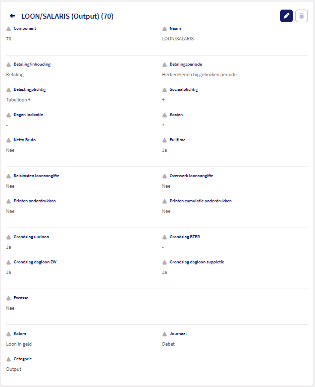 De componenten worden per CAO vastgelegd. De geactiveerde componenten kunnen niet op loonmodel- of werkgeverniveau worden verwijderd. In de meeste categorieën zijn vrije looncomponenten beschikbaar met een soortgelijke salaristechnische werking.