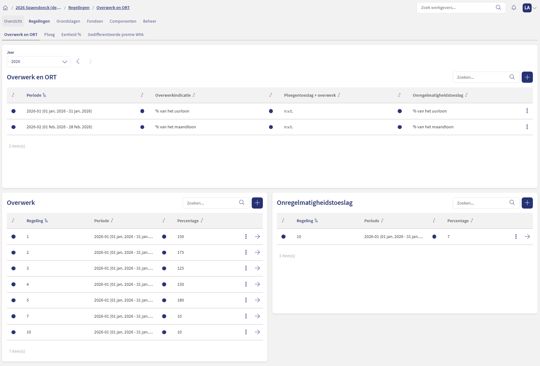 Er kunnen in totaal 15 ploegen worden vastgelegd. Een ploeg bevat normuren (uren op fulltime basis) en optioneel een ploegpercentage. De ploegentoeslag wordt uitsluitend berekend over het basisloon. Daarnaast bestaat de mogelijkheid om de ploegentoeslag ook op te nemen in het overwerk (zie hieronder onder het kopje Overwerk en ORT). Het is niet mogelijk afzonderlijke componenten op te nemen in de ploegentoeslag. Hiervoor kan eventueel wel een grondslag worden opgebouwd. Het is tevens mogelijk om een standaard ploeg te selecteren voor de wizard Nieuwe werknemer. Dit kan in Loket Classic op het tabblad Adm via Algemeen -> Inrichting -> Jaar selecteren -> Standaard ploeg selecteren. Vaak zijn in de cao de ploegen al ingevoerd. Op loonmodel- en werkgeverniveau is het dan mogelijk om afwijkingen op de cao op te geven. Op werknemerniveau wordt onder de Arbeidstijd aangegeven welke ploeg van toepassing is.