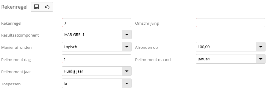 Als bijvoorbeeld het basisloon per 1-1 van het jaar bepalend is voor de rekenregel kies je voor peilmoment dag = 1, peilmoment maand = januari en peilmoment jaar = huidig jaar.