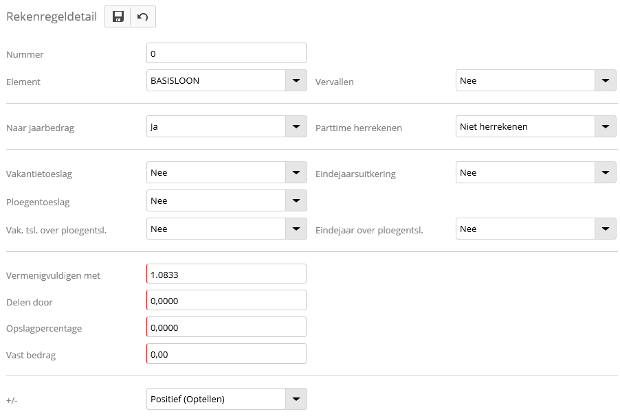 Resultaat van de detailregel wordt vermenigvuldigd met de opgegeven waarde. Deze optie kan gebruikt worden voor een opslag van vakantiegeld en/of eindejaarsuitkering.