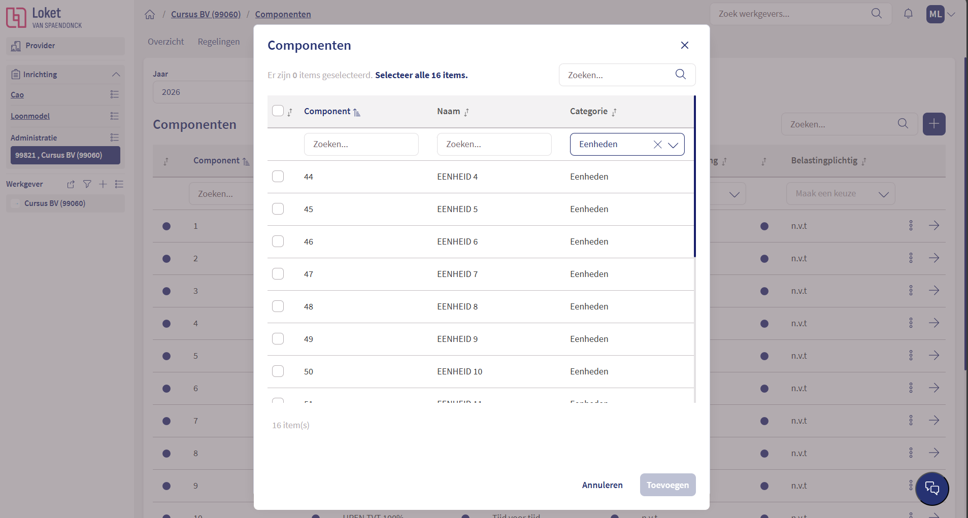 - Voeg een eenheid component toe: Klik op het plusje bij Componenten, kies categorie Eenheden en vink het componentnummer aan.
