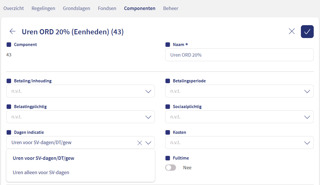 - Worden er uren verloond op dit component? (Bijv: Bij een toeslag van 20% wordt geen uur uitbetaald, alleen een toeslag. De Dagen indicatie laat je in dit geval op Nvt staan.)