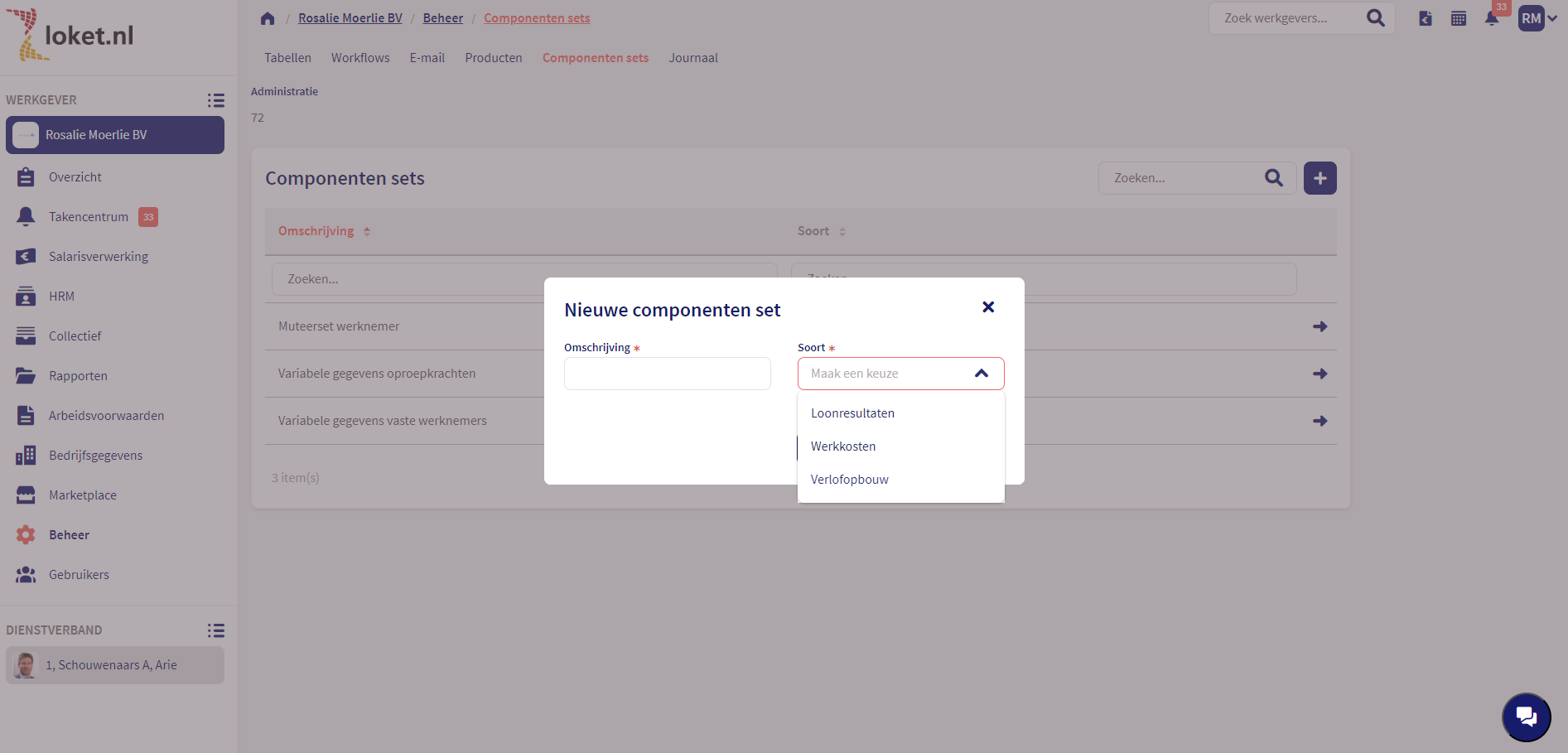 Werkgever -> Beheer -> Exportsets ->Componentenset -> Nieuwe componentenset