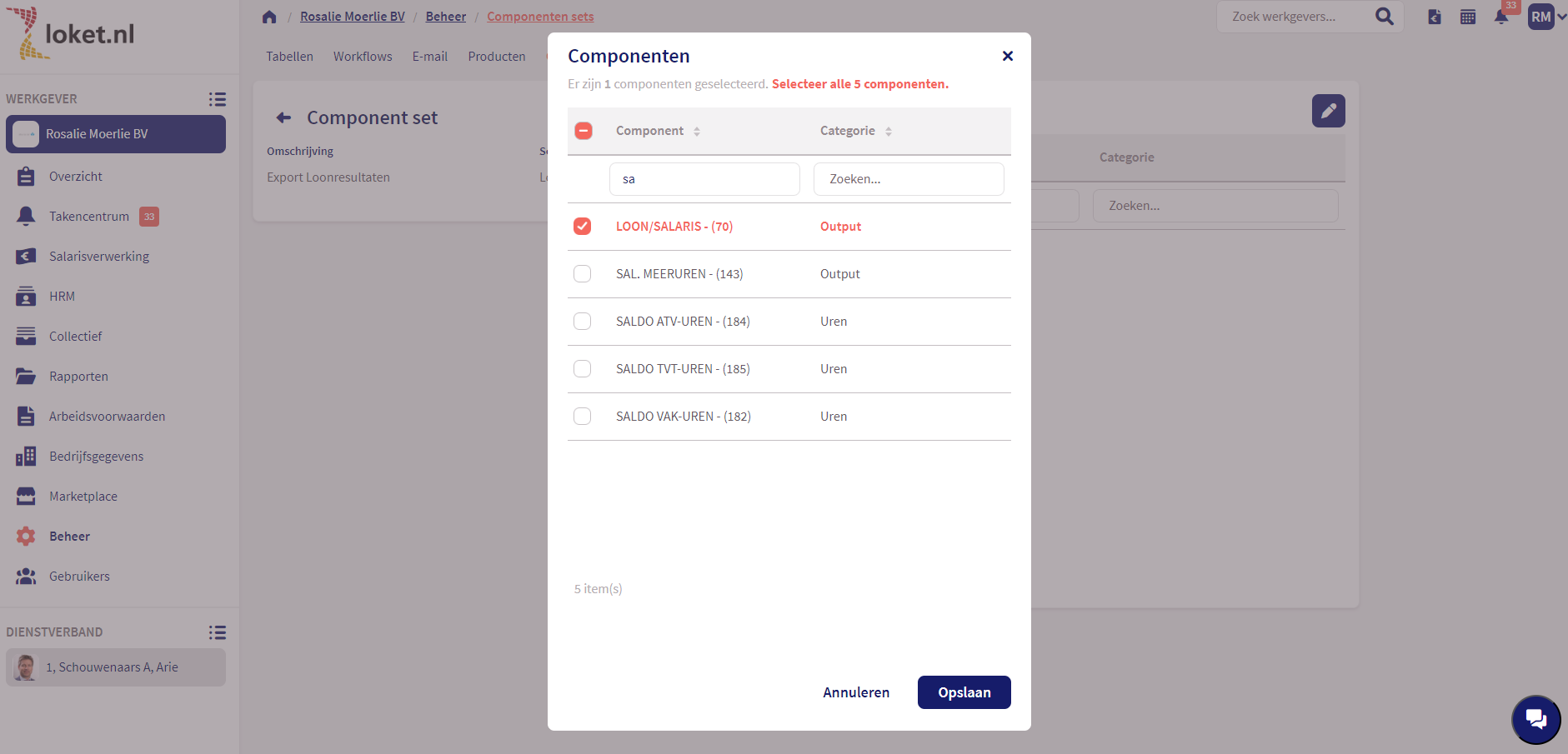 Vervolgens kunnen de gewenste looncomponenten via de optie Exportset looncomponenten aan deze exportset worden toegevoegd.
