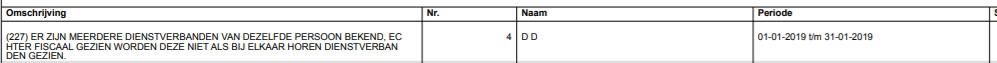 Als een medewerker meerdere dienstverbanden heeft maar niet aan alle condities voldoet zal onderstaand signaal worden getoond. Dit signaal wordt eenmalig gegenereerd namelijk in de eerste periode dat dit zich voordoet, dus voornamelijk in periode 1 en bij het ontstaan van de situatie in de loop van het jaar. Indien in een periode wel wordt voldaan aan de criteria voor samentelling dan zal signaal 227 blijven verschijnen voor periode 1. Is het signaal eenmaal gegenereerd dan wordt de signaallijst bij iedere salarisrun getoond met periode 1-1 t/m 31-1:
