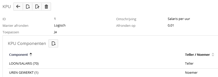 De rekenregel gaat uit van een teller en een noemer. Je kunt meerdere componenten opnemen in de teller en/of noemer. In onderstaand voorbeeld een eenvoudige weergave van een inrichting waarbij je het Loon/Salaris per uur kunt berekenen.