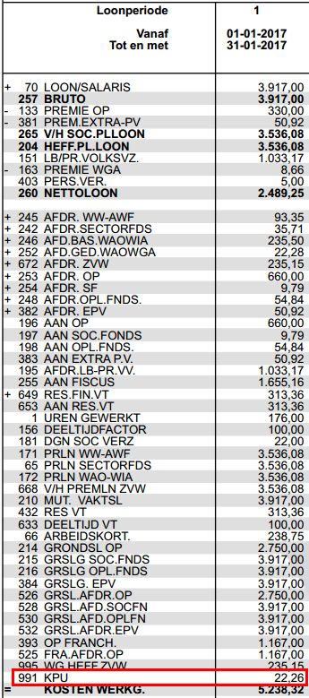 Het is mogelijk om loonresultaten op elkaar te kunnen delen d.m.v. het toevoegen van een KPU rekenregel. KPU staat voor kostprijs per uur. Je zou dus bruto looncomponenten kunnen delen op gewerkte uren om te komen tot een kostprijs per uur. De inrichting is flexibel zodat je vrij bent in het bepalen van de teller en de noemer.