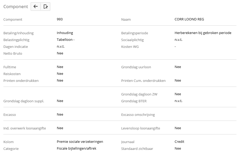 Op werknemerniveau dient het bedrag dat wordt opgegeven bij component 993 gelijk te zijn aan het bedrag aan salaris. Het component 993 wordt gevuld in de periodieke gegevens van de werknemer via Arbeidsvoorwaarden -> Toeslagen en inhoudingen, categorie Fiscale bijtellingen/aftrek. Op deze manier wordt het heffingsplichtig loon (204) 0 zodat er in de administratie geen LB/PR. VOLKSVERZ. wordt ingehouden en in de loonaangifte geen heffingplichtig loon en ingehouden LB/Pr.Volksverz wordt doorgegeven. Wel worden de premies werknemerverzekeringen berekend en aangegeven in de loonaangifte. Daarnaast dient bij de fiscale gegevens van de medewerker het veld "Toepassen afw. %" op "afwijkend voor tabel en tariefloon" te worden gezet. Het percentage moet op 0% staan. De code loonbelastingtabel "999" die mag je doorgeven via Salarisverwerking > Fiscale gegevens > Code loonbelasting tabel, want dit is verplicht in de loonaangifte voor de doorbetaaldloonregeling.