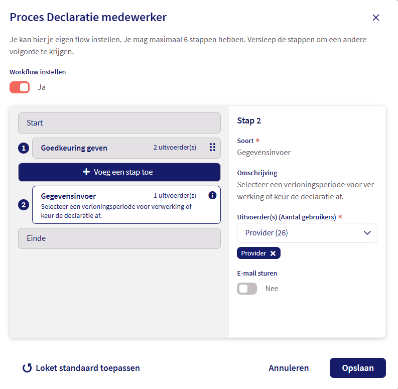 - Controleer of er een declaratie‑workflow bestaat.