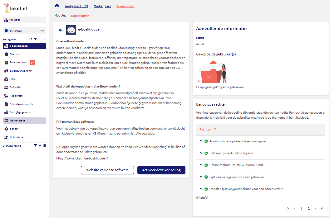 Je activeert de koppeling eenvoudig via de Marketplace in Loket.nl. Klik bij e-Boekhouden op ‘Activeer deze koppeling’, vul het formulier in en wij nemen je aanvraag als ticket in behandeling. Zo geregeld!