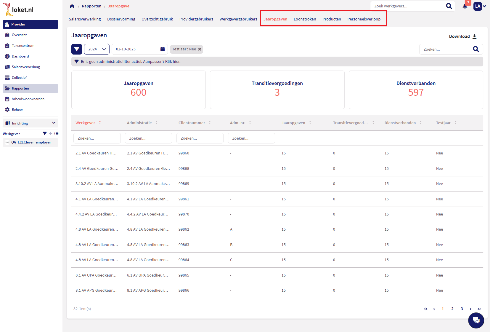 We hebben in deze release een aantal provideroverzichten overgebouwd van Loket Classic naar Loket. In plaats van statische overzichten hebben we ervoor gekozen om de overzichten interactiever te maken met de mogelijkheid om deze te exporteren naar CSV/Excel. Het gaat hier om overzichten die inzicht geven in het aantal loonstroken. jaaropgaven, welke producten er bij een werkgever zijn geactiveerd en hoe over alle werkgevers heen het personeelsverloop is.
