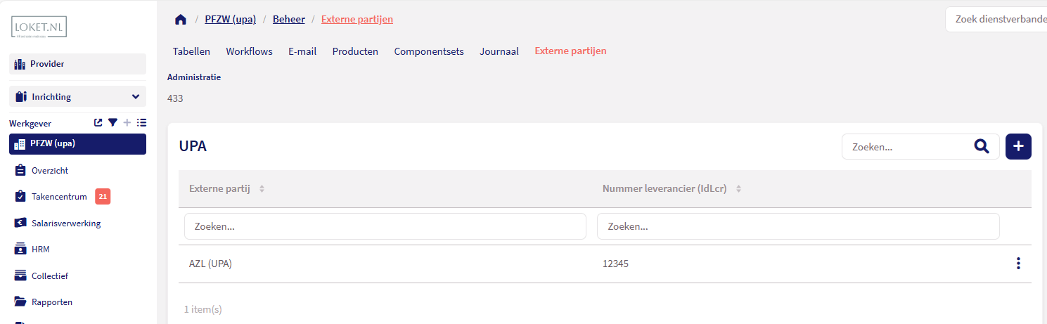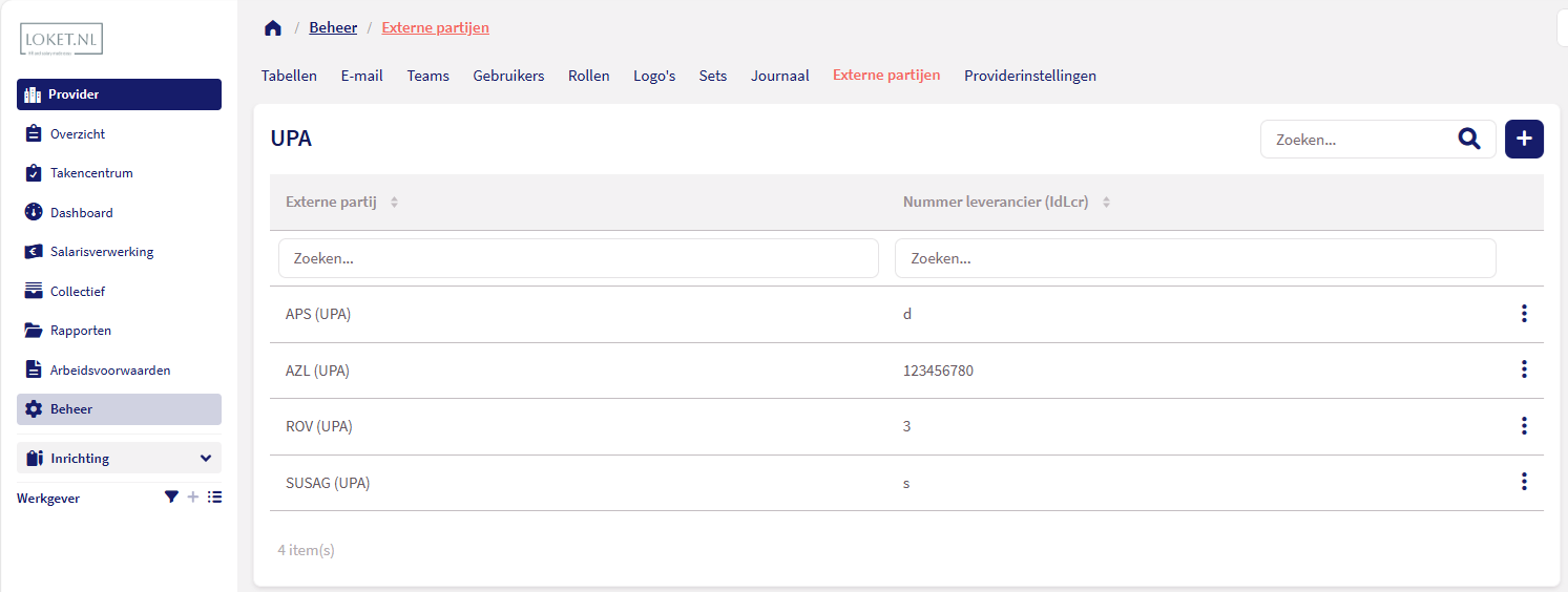 In een aantal gevallen (UPA partijen) kun je op provider- en werkgeverniveau gegevens vastleggen t.b.v. de aanlevering aan de externe partij. Vanaf deze update maken we dit mogelijk in Loket. De gegevens zijn essentieel bij de aanlevering aan UPA, we moeten deze gegevens kunnen administreren. We bouwen over vanuit Loket classic, waarbij we het aantal aan te leveren partijen flink schonen. De optie op zowel provider- als werkgeverniveau in Loket classic komt hiermee te vervallen.