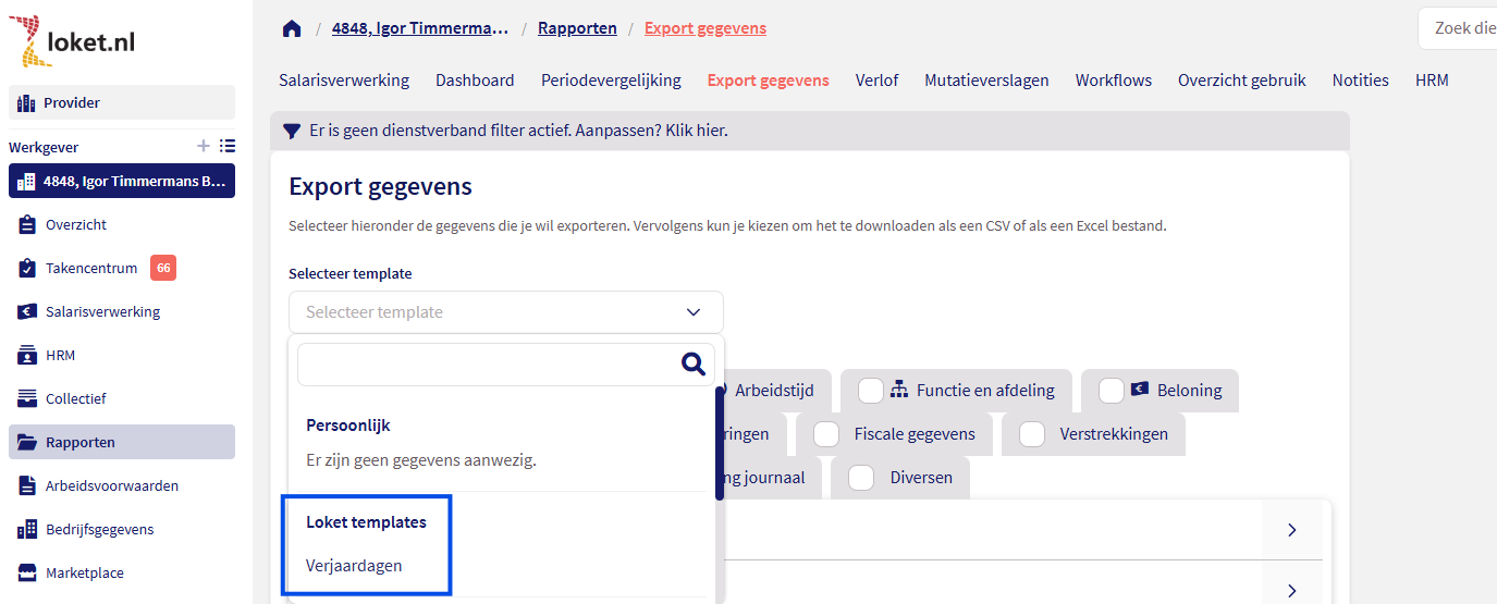 We hebben de mogelijkheid gemaakt om de signalen in het takencentrum te exporteren. Hierdoor is het niet meer nodig om te switchen naar Loket Classic voor het overzicht voor signalen op werkgeverniveau.