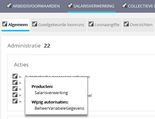 - Navigeer naar de functionaliteit die de gebruiker nodig heeft. Plaats de cursor op het sleuteltje en je ziet welk recht bij de gebruiker aan moet staan. Het pop-upvenster toont tevens het product wat aan moet staan.