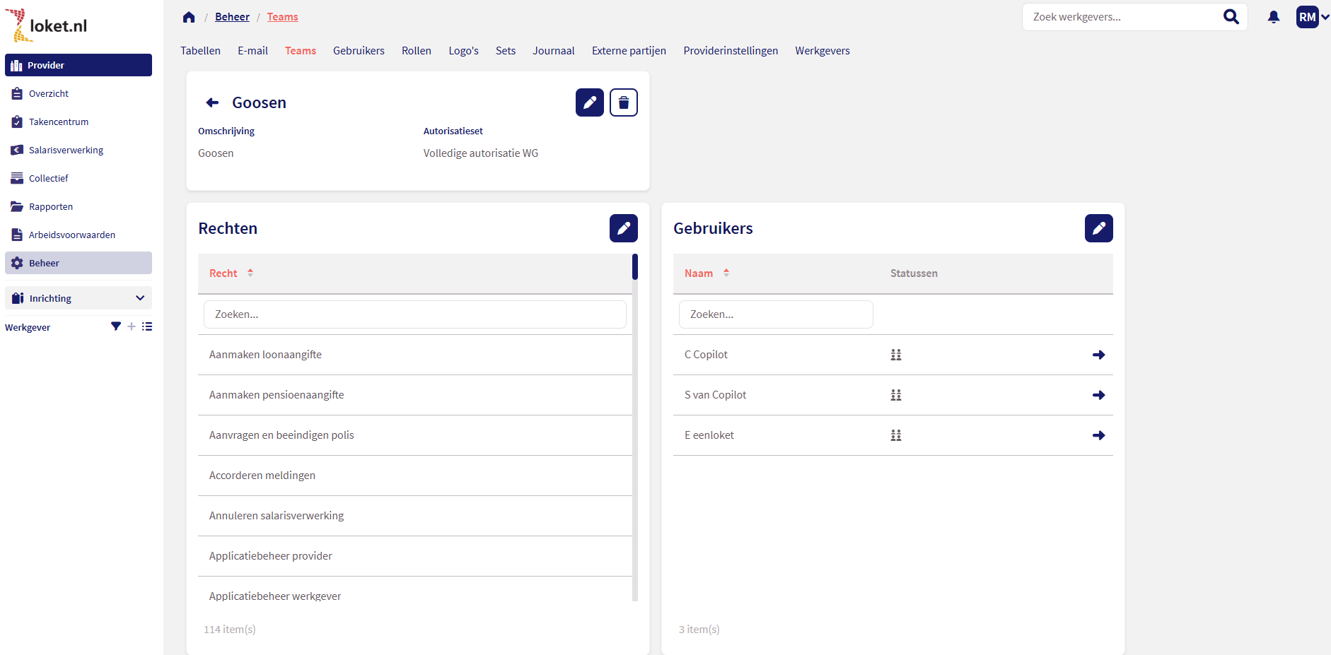 Teams: In Loket op providerniveau worden rechten vastgelegd op teamniveau. Ga op providerniveau naar Beheer - Teams en leg hier naast de gebruikers en de werkgevers de juiste rechten vast. Alle gebruikers in het team hebben voor de betreffende werkgevers de vastgelegde rechten.