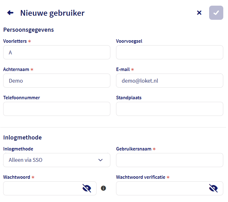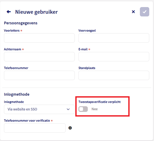 Om een nieuwe gebruiker uit te nodigen vul je eerst de benodigde gegevens in waarbij de velden Voorletters, Achternaam, Email en Telefoonnummer verificatie verplicht zijn. Gebruik een geldig Nederlands telefoonnummer, of voor een internationaal telefoonnummer het volgende formaat: +32612345678. Let op: het telefoonnummer verificatie wordt niet opgeslagen bij de gebruiker.