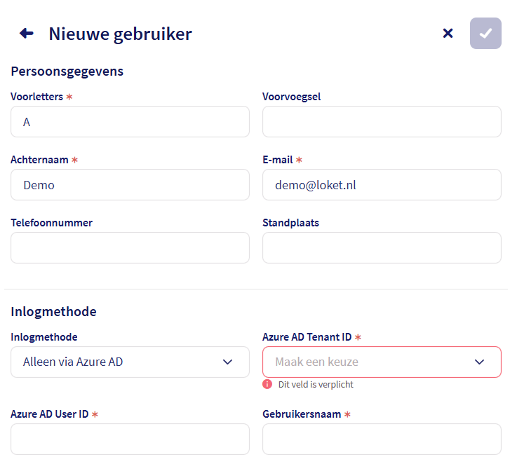 - Bij Azure AD User ID zal de userid gevuld moeten worden zoals de user bij Microsoft bekend is.