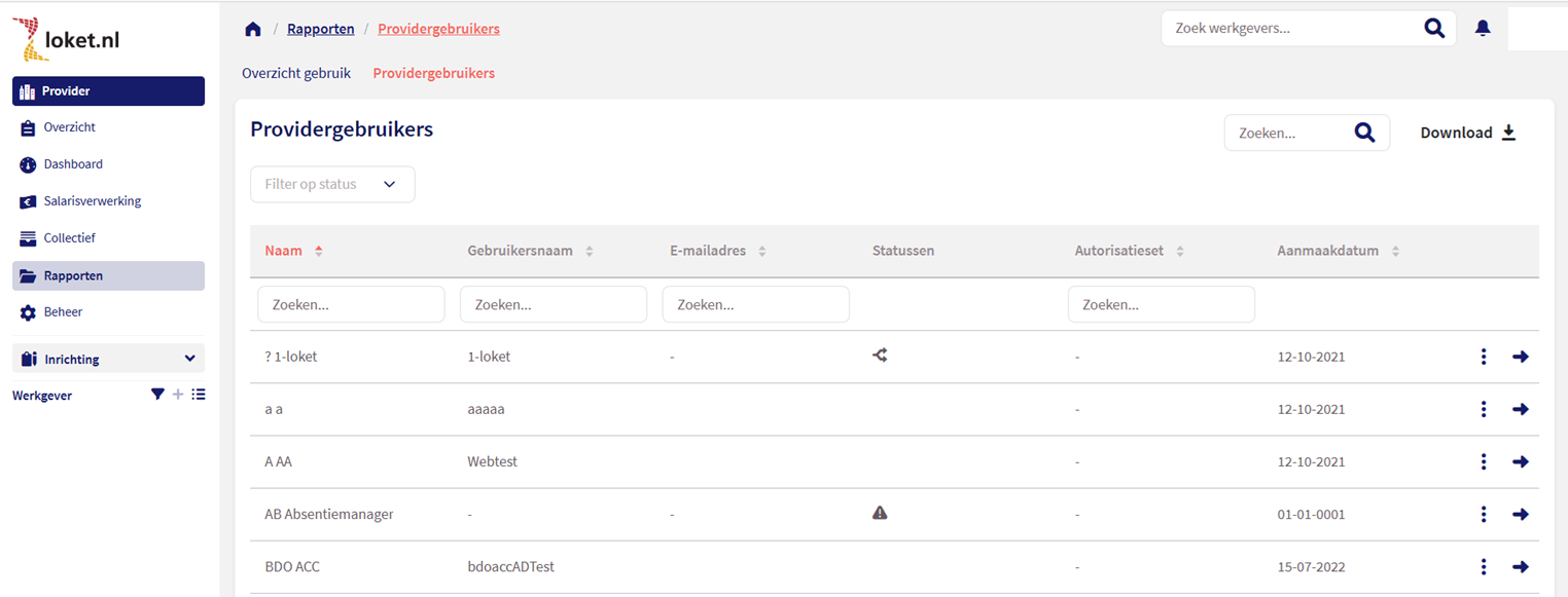 Wens je een totaaloverzicht van van alle AK-gebruikers? Deze vind je terug onder Rapporten - Providergebruikers. In dit interactief overzicht kun je filteren op bepaalde statussen en eenvoudig een download maken van de weergegeven gebruikers.