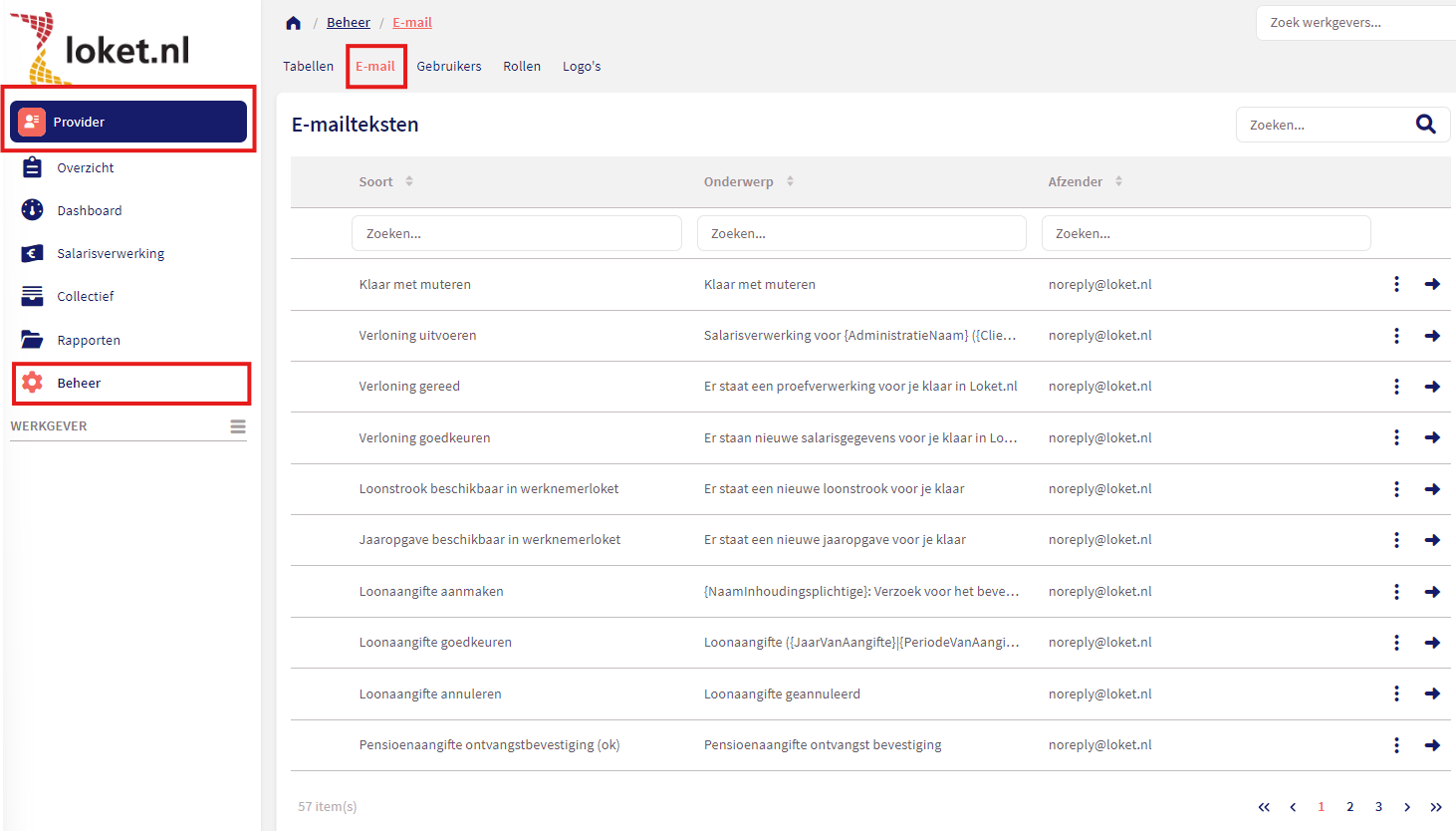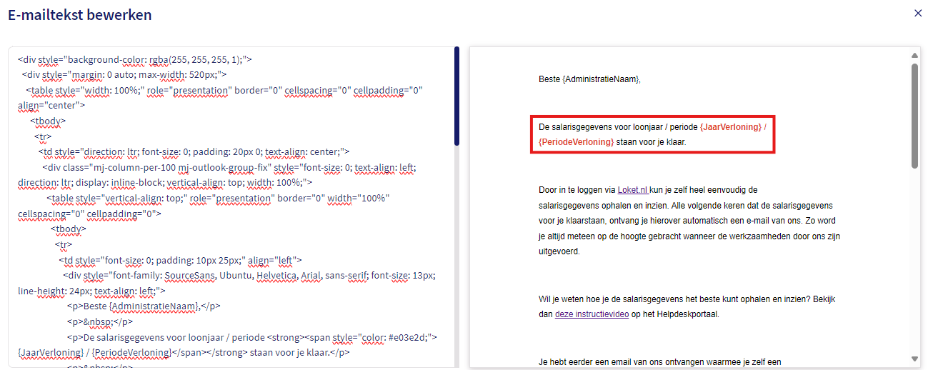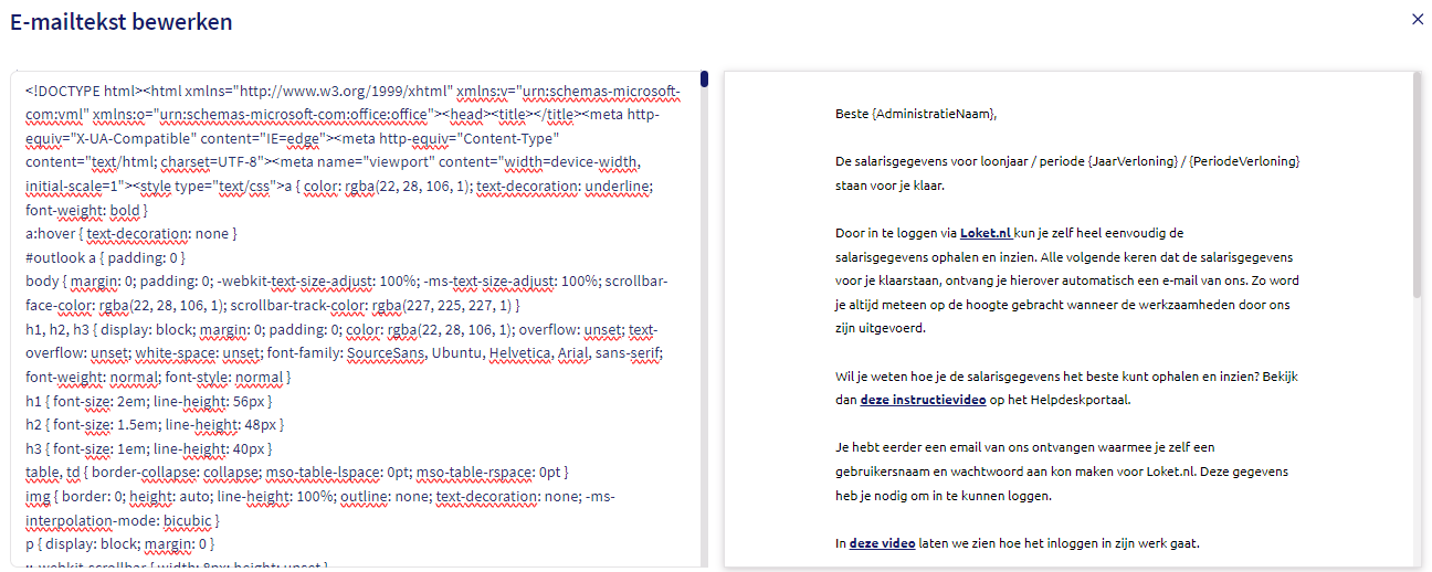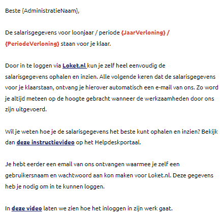 Ga in Loket bij de werkgever naar Beheer -> E-mail -> Emailteksten