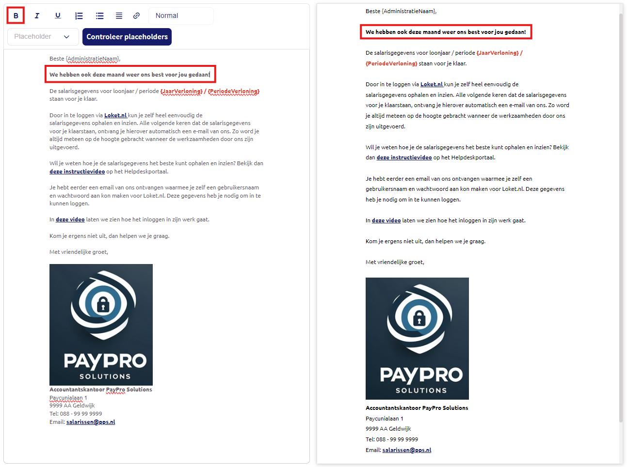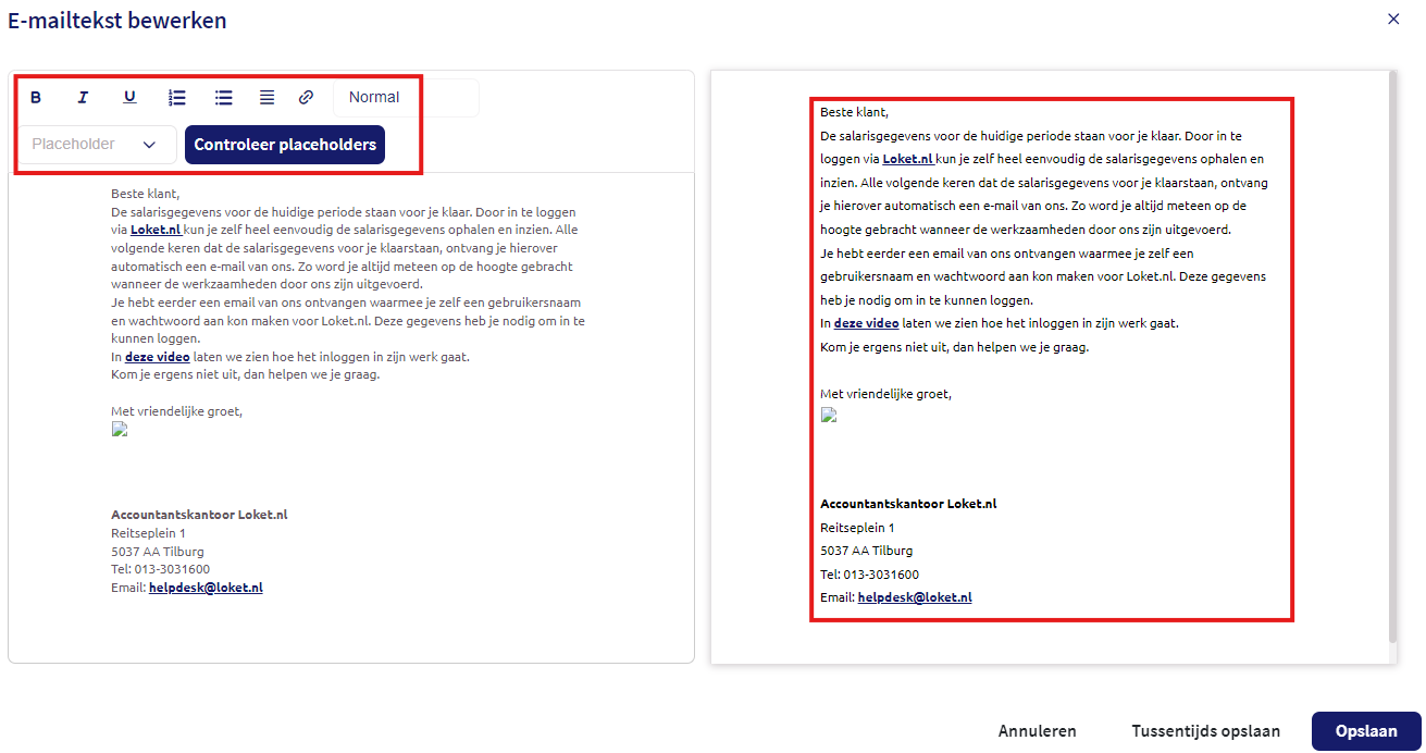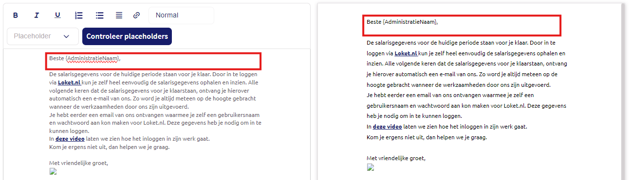 Na het kiezen voor deze optie wordt links het onderhoudsscherm van de e-mailtekst getoond. Rechts zie je in het resultaatscherm hoe de e-mailtekst er daadwerkelijk uit komt te zien na bewerking.