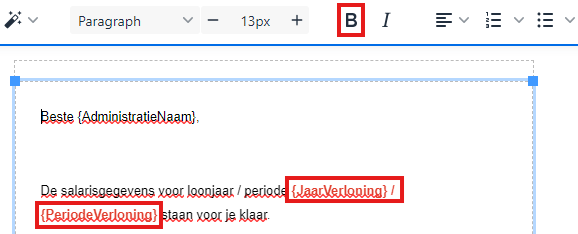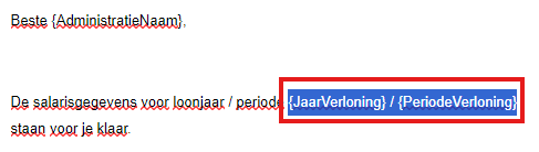 In de tekst direct na de aanhef wil je de tekst m.b.t. het loonjaar en de loonperiode een andere kleur geven, zodat dit direct opvalt in de e-mailtekst. Blader zover naar boven tot deze tekst in beeld staat.