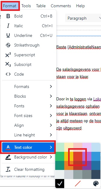 Ga in de HTML-converter naar Format -> Text colour en selecteer de gewenste kleur. In dit voorbeeld kiezen we voor rood.