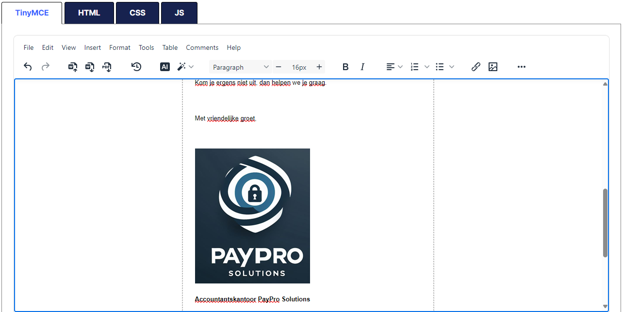 Deze optie kun je gebruiken als je de e-mailtekst verder wilt bewerken door het aanpassen van de HTML-code van de e-mailtekst. Bijvoorbeeld als je bepaalde stukken tekst een andere kleur wilt geven en/of als je zelf het logo via de HTML-editor wilt toevoegen om het vervolgens te vergroten of verkleinen.