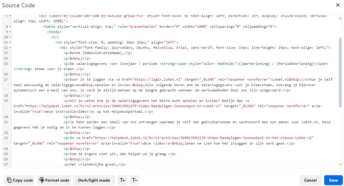 Selecteer en kopieer de complete HTML-code uit het onderhoudsscherm van Loket van de betreffende e-mailtekst.
