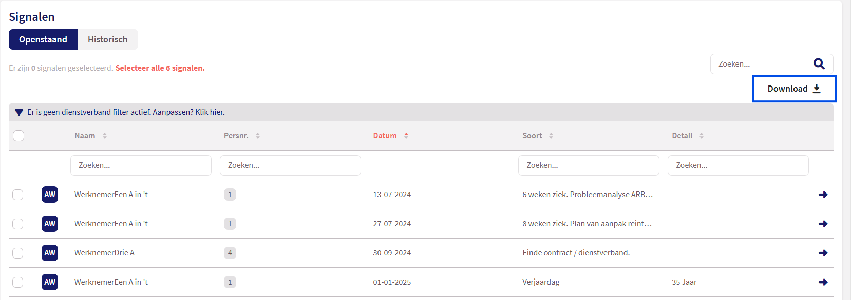 Daarnaast is er de mogelijkheid om signalen te exporteren. Wanneer je dit downloadt, krijg je een overzicht van signalen op werkgeverniveau.