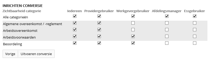 - In het volgende scherm kan per documenttype aangegeven worden wie er toegang heeft. Deze instellingen kunnen, indien gewenst, aangepast worden met de autorisatiematrix. Klik vervolgens op Uitvoeren conversie.