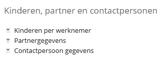 Zodra de werknemer geselecteerd wordt tref je onder het tabblad Persoon de velden Contactpersonen, Partner en Kind aan (zie onderstaande schermafdruk). Gegevens van contactpersonen leg je bijvoorbeeld vast voor calamiteiten. Denk hierbij aan gegevens van de huisarts of van degene die op de hoogte moet worden gebracht in geval van een calamiteit. Je kunt een onbeperkt aantal contactpersonen vastleggen. De contactpersoongegevens zijn ook in de Werkgeverapp te raadplegen.