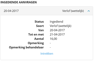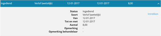 Ook via de menuoptie HRM -> Verlof -> Onder Overzicht verlofaanvragen kun je de ingediende verlofaanvra(a)g(en) raadplegen en intrekken. Als je de betreffende verlofaanvraag aanklikt en kiest voor Intrekken wordt de ingediende verlofaanvraag ingetrokken.