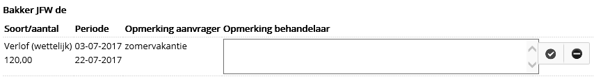 Door in de verlofkalender op de openstaande verlofaanvraag te klikken, opent zich het volgende vervolgscherm waarin de verlofaanvraag kan worden goedgekeurd of geweigerd en eventueel een opmerking aan kan worden toegevoegd: