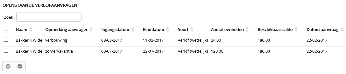 Om de verlofaanvra(a)g(en) te behandelen kun je met behulp van het bovenste vierkantje alle openstaande verlofaanvragen in één keer selecteren en met behulp van de iconen