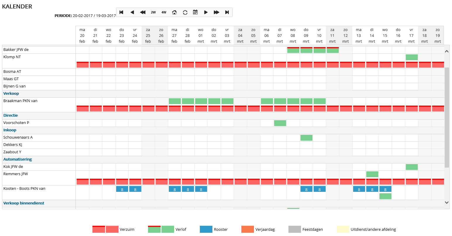 Op de kalender staan per afdeling de medewerkers, waartoe de gebruiker die het overzicht oproept gemachtigd is, weergegeven. Per medewerker zijn de volgende situaties mogelijk zichtbaar: