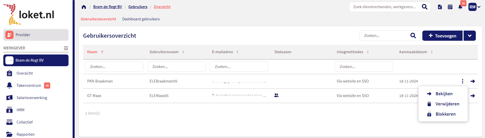 Voor het verwijderen van een werkgevergebruiker, selecteer je de desbetreffende werkgevergebruiker in het Gebruikersoverzicht. Druk hier op het vuilnisbakicoontje om de gebruiker te verwijderen.